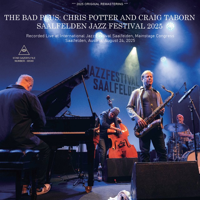 SGF-00549 // THE BAD PLUS: CHRIS POTTER AND CRAIG TABORN / SAALFELDEN JAZZ FESTIVAL 2025 (1CDR) Recorded Live at International Jazz Festival Saalfelden, Mainstage Congress, Saalfelden, Austria, August 24, 2025 EXCELLENT Soundboard Recording // 68 min Chris Potter - tenor saxophon Craig Taborn - piano Reid Anderson - double bass Dave King - drums 1. (IF THE) MISFITS (WEAR IT) 2. GOTTA FET SOME SLEEP 3. LE MISTRAL 4. SILENCE - Announcement by Reid Anderson 5. MUSHI MUSHI 6. ENCORE A クリス・ポッターとクレイグ・タボーンを軸に据えたザ・バッド・プラスによるサウンドボード・ライヴ音源です。デューイ・レッドマン、チャーリー・ヘイデン、ポール・モチアンを従えたキース・ジャレットのアメリカン・カルテットへの敬愛を表したカルテットで、メンバーいずれも名手ぞろいです。音質はオフィシャル・レベルの最上級で。キース・ジャレット・アメリカン・カルテットのファン、そして「エレクトリックが入ったジャズはちょっと・・」といった頑固な(失礼しました)ジャズ・ファンにもぜひ聴いていただきたい名演です。