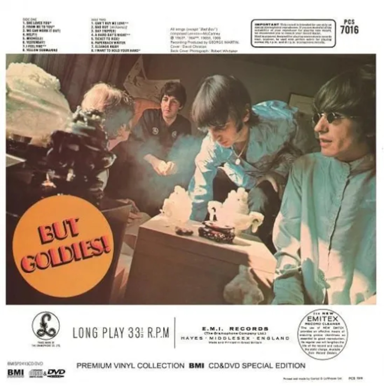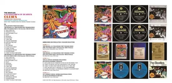 今回の音源コレクション『オールディーズ』(A COLLECTION OF BEATLES' OLDIES...BUT GOLDIES!)はイギリスにおいて1966年12月10日に発売されたビートルズ初の公式オリジナル・ベスト(グレイテスト・ヒッツ)・アルバムである。英国ではデビュー以来、年間2枚のアルバム制作が行われてきたが66年8月のアルバム『リボルバー』に続く新作が出来ないことから代替案としてベスト・アルバムを企画しクリスマス期間中の需要を満たすため12月に臨時発売されている。英国はじめヨーロッパ、日本含む世界各国でリリースされたが独自編集でアルバムを出し続けていたアメリカ・キャピトルでは何故か発売されなかった。これまでのアルバム同様に英国ではステレオとモノラルが発売されたがアルバム未収録のシングル曲を数多く含むこの編集盤は当時のシングルやEPではモノラルのみのリリースだった曲のステレオ・ミックスが作られていなかった為に66年10月31日から11月10日までミキシング・セッションが行われている。マスターが破棄されていた「シー・ラブス・ユー」はモノラルからの疑似ステレオ化しか出来なかったが「抱きしめたい」「フロム・ミー・トゥ・ユー」「アイ・フィール・ファイン」「デイ・トリッパー」「ウィ・キャン・ワーク・イット・アウト」「ペーパーバック・ライター」のステレオ・バージョンが制作されこれらは当然ながら米国キャピトル・ステレオとは異なる初登場のステレオ・ミックスとなっている。この時のミキシング・セッションでは「ディス・ボーイ」のステレオ・ミックスも制作されたがこれはEMIエンジニアのミスで「バッド・ボーイ」と取り違えていたというエピソードも残されている。「バッド・ボーイ」に関しては米国キャピトル・アルバム『ビートルズVI』で既に先行発売されていたが英国ではアルバム唯一の初登場曲で当時の日本盤帯にも”未発表曲「バッド・ボーイ」収録”が売り文句となっていた。アルバム・カバーは画家デイヴィッド・クリスチャンによるもので当時のロンドン・カーナビー・ストリートの流行を捉えている。ジャケット裏面は66年日本公演時に滞在していた東京ヒルトンで撮影されたもので写真が裏焼(左右逆転)になっているがポールの着ている半被の「寿」の文字が逆になっていることに気付いた日本では発売当時から修正されている。英国発売当時は既発曲の寄せ集めとの批評もあったもののビートルズ前期後期の分岐点として後の赤盤青盤コンセプトの元にもなったともいえる。今となっては赤盤の存在もあってこれまで一度もCD化されずに公式カタログからは消えた企画編集盤ではあるがレコード盤としてはビートルズ初のオリジナル・ベスト・アルバムである。今回の復刻音源コレクションCDではその英国オリジナル・モノラル初盤とステレオ初盤からアナログ盤ダイレクト・トランスファーで両音源を収録。そのミックスの違いを聞き比べることが出来るだけでなくアナログ盤ダイレクトならではの鮮度抜群の音源でデジタル・リマスターCDとは音の質感が異なる60年代当時のオリジナル音源となっている。DVDは”ハイレゾ&HQオーディオ・セレクション”として高音質ハイレゾ音源を含む4種音源がオーディオDVD形式で収録されており音源の違いを聴き比べることが出来る。オーディオ1には英国オリジナル・モノ初盤の音源を収録。CD以上のハイスペックでレコードの質感をそのまま再現する高音質ハイレゾ・フォーマット(96khz/24bit)で収録。CDと聴き比べるとより一段と原音に近いクオリティで収録されている。オーディオ2には英国オリジナル初盤のステレオ音源を収録。オーディオ3には1970年に発売された英国8トラック・ステレオ・テープからの音源を収録。音質的にはレコードに比べクオリティは劣るものの音の質感はだいぶ異なり曲順自体も入れ替わった独自の編集となっている。そしてオーディオ4には1971年ドイツで発売されたオデオン・レーベルのステレオ盤を収録。ドイツ盤は独自のリマスタリングが施されておりステレオ・セパレーションが若干異なるミックスとなっている曲はじめ「ウィ・キャン・ワーク・イット・アウト」は疑似ステレオ、「デイ・トリッパー」は米国キャピトル・ステレオ・ミックス、「アイ・フィール・ファイン」も英国とは異なるエンディングの長いステレオ別ミックスさらに「ティケット・トゥ・ライド」では編集ミスからかイントロの短いエディット・バージョンが収録されている。いずれも今となっては入手困難なプレミア・アイテムとなった貴重な4大ヴィンテージ音源をまとめて再現した『オールディーズ』のアナログ音源エディション!英国盤を模したコーティング紙ジャケット仕様で本物のオリジナル・アナログ・サウンドを再現したまさに究極の完全復刻永久保存盤コレクションとなっている。