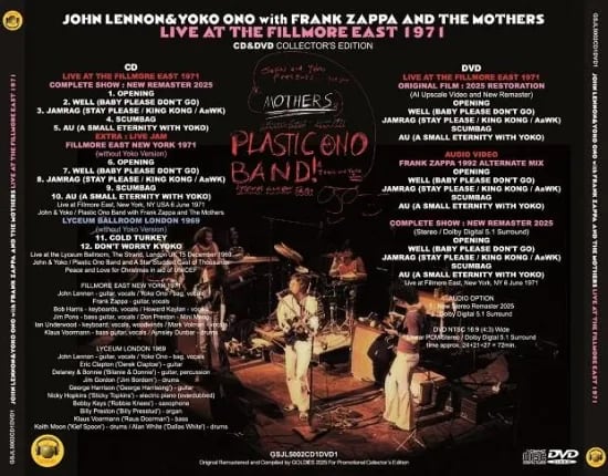 1971年6月6日ニューヨーク・フィルモア・イーストでのフランク・ザッパ・アンド・ザ・マザーズ公演のアンコールにジョン&ヨーコがゲスト出演しジョン・レノンとフランク・ザッパの初共演が実現した歴史的ライブが最新編集によるコレクターズ・エディションとしてGOLDIESレーベルから登場!元々はジョン・レノン&ヨーコ・オノ/プラスティック・オノ・バンド名義で72年に発表されたアルバム『サムタイム・イン・ニューヨーク・シティ』の”ライブ・ジャム”としてリリースされたがそこではジョン・サイドで若干短く編集されたエディット・バージョンで収録。当時から双方で発売権を合意していたがかなり経過した1992年になってザッパ・サイドで編集されたバージョンも異なるミックスで初リリースされこの後2022年ミックスも最長版としてボックスセットでリリースされている。ここでは最長版の元となったマスターから既発のバージョンとは異なる独自のミックスによる最新編集バージョンとなっている。CDにはその”コンプリート・ショウ:ニュー・リマスター2025”バージョンが前半に収録。既発音源に比べノーカット最長編集で音質自体もより原音に近い生々しいロウ・ミックスでボーカルや楽器も一段とリアルに迫る極上クオリティとなっている。CD後半はアルバム『サムタイム・イン・ニューヨーク・シティ』のライブ・ジャムからヨーコのボーカルや奇声だけをオミットした”ヨーコレス・バージョン”で収録されている。71年フィルモア・イーストに加え69年ロンドン・ライシアムでの2曲も収録されておりこちらはクラプトン、ジョージ・ハリスン、デラニー&ボニー、ビリー・プレストン、ニッキー・ホプキンスからキース・ムーンまで超豪華メンツのスーパー・セッションでジョン迫真の熱演ぶりが伝わる注目のライブである。フィルモア・イーストとライシアム共に歴史的なスーパー・セッションながらヨーコが苦手で聴かず嫌いだった貴方もこの”ヨーコレス・バージョン”であの声に邪魔されずストレートに演奏のカッコ良さを実感で出来るミックスとなっている。DVDには唯一残されたフィルモア・イーストのライブ映像を収録。これまで画質の悪かったフィルム映像素材をAI修復で画質クオリティを改善。元にある邪魔だったタイムコードもマスキングを施し音声もニュー・リマスター音源に差し替えたアップグレード映像で収録されている。さらにオーディオだけのDVDセクションには92年のザッパ・ミックスとニュー・リマスター2025バージョンのステレオ&ドルビー・デジタル5.1サラウンド・ミックスも追加収録。それぞれの音源のミックス違いを聞き比べることが出来る仕様である。ジョン・レノンとフランク・ザッパの初共演となったフィルモア・イーストでの歴史的ライブを複数ある音源とAI修復された映像でまとめた2025年版最新編集CD&DVDコレクターズ・エディションとして注目の内容となっている。