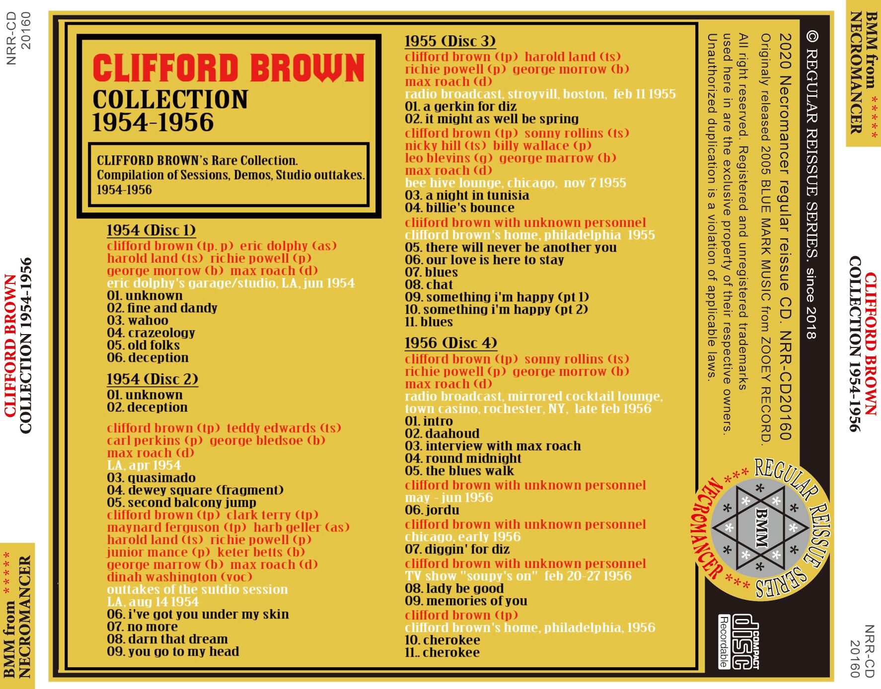 "1954" Disc 1: Clifford Brown (Tp.P) Eric Dolphy(As) Harold Land (Ts) Richie Powell (P) George Morrow (B) Max Roach (Dr) Eric Dolphy's Garage / Studio LA Jun 1954 01 Unknown 02 Fine And Dandy 03 Wahoo 04 Crazeology 05 Old Folks 06 Deception "1954" Disc 2: Clifford Brown (Tp.P) Eric Dolphy(As) Harold Land (Ts) Richie Powell (P) George Morrow (B) Max Roach (Dr) Eric Dolphy's Garage / Studio LA Jun 1954 01 Unknown 02 Deception Clifford Brown (Tp) Teddy Edwards (Ts) Carl Perkins (P) George Bledsoe (B) Max Roach (Dr) LA Apr 1954 03 Quasimado 04 Dewey Square 05 Second Balcony Jump Clifford Brown (Tp) Clark Terry (Tp) Maynard Ferguson (Tp) Harb Geller (As) Harold Land (Ts) Richie Powell (P) Junior Mance (P) Keter Betts (B) George Marrow (B) Max Roach (Dr) Dinah Washington (Voc) Outtakes Of The Studio Session LA.Aug 14 1954 06 I've Got You Under My Skin 07 No More 08 Darn That Dream 09 You Go To My Head "1955" Disc 3: Clifford Brown (Tp) Harold Land (Ts) Richie Powell (P) George Marrow (B) Max Roach (Dr) Radio Broadcast Stroyville Boston Feb 11 1955 01 A Gerkin For Diz 02 It Might As Well As Spring Clifford Brown (Tp) Sonny Rollins (Ts) Nicky Hill (Ts) Billy Wallace (P) Leo Blevins (G) George Morrow (B) Max Roach (Dr) 03 A Night In Tunisia 04 Billie's Bounce Cliford Brown With Unknown Personal Cliford Brown ‘s Home Philadelphia 1955 05 There Will Never Be Anotheer You 06 Our Love Is Here To Stay 07 Blues 08 Chat 09 Something I'm Happy(Pt.1) 10 Something I'm Happy(Pt.2) 11 Blues "1956" Disc 4: Clifford Brown (Tp) Sonny Rollins (Ts) Richie Powell (P) George Morrow (B) Max Roach (Dr) Radio Broadcast Mirrored Cocktail Lounge Town Casino Rochester ,NY,Late Feb 1956 01 Intro 02 Daahoud 03 Interview With Max Roach 04 Round Midnight 05 The Blues Walk Cliford Brown With Unknown Personal May - Jun 1956 06 Jordu Cliford Brown With Unknown Personal Chicago early 1956 07 Diggin' For Diz Cliford Brown With Unknown Personal Chicago early 1956 tv show "soupy's on" feb 20 - 27 1956 08 Lady Be Good 09 Memory's Of You Clifford Brown (Tp) Cliford Brown's Home Philadelphia 1956 10 Cherokee 11 Cherokee