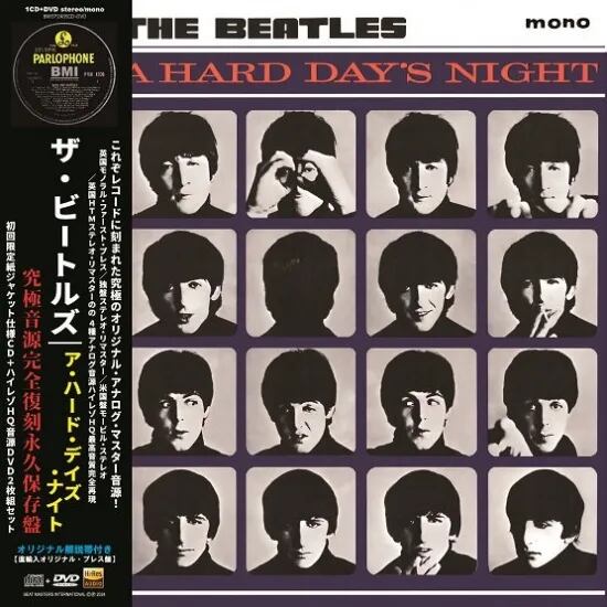 CD後半には1984年にリリースされた英国シルバー・パーロフォン再発盤HTM1984ステレオ・リミックス音源を収録。アビイ・ロード・スタジオの名エンジニアであるハリー・モス・カッティングによるこの音源は英国オリジナルの通常ステレオ・ミックスと比較して音自体がはっきりと明瞭で中高域がブライトになったことによってボーカルやコーラスがより聞こえやすく各楽器の分離度も高いミックスが施された80年代版独自の注目すべきステレオ・リマスターでこれもまたデジタル・リマスターされた現行のものとは異なるアナログ盤ならではの音源である。DVDは”ハイレゾ&HQオーディオ・セレクション”として高音質ハイレゾ音源を含む4種音源がオーディオDVD形式で収録されており音源の違いを聴き比べることが出来る。オーディオ1には英国オリジナル初盤のモノラル音源を収録。CD以上のハイスペックでレコードの質感をそのまま再現する高音質ハイレゾ・フォーマット(96khz/24bit)でアナログ・レコードの音を聴くことが出来る。オーディオ2には1976年ドイツ・オデオン再発盤のステレオ音源を収録。英国オリジナル盤ステレオ・ミックスと異なりこのドイツ盤ではより一段とステレオ感を出すためかエコー成分等のエフェクトが加えられた独自のステレオ・ミックスとなっておりここでしか聴くことが出来ないレア・ミックス音源である。オーディオ3には1982年米国で発売されたモービル・フィデリティ(MFSL)盤からのステレオ音源を収録。数ある各国の通常盤と比べクリアでバランスに優れたオーディオ・リファレンスとして最上級のアナログ・マスターと評価されており英国オリジナル・マスターからのステレオ音源を高音質で限定レコード・プレスしたことで人気の高いモービル盤から収録されたステレオ・ミックス定番音源である。そしてオーディオ4には1984年に再発された英国盤HTM1984ステレオ・リミックス音源を収録。こちらもCD以上のスペックとなるHQ(ハイ・クオリティ48khz)音源となっている。DVD映像には各レコード・ジャケットとレーベル写真をスライドショウ形式でそれぞれ再生されオーディオ・セレクトによって各音源を選択する仕様になっている。いずれも今となっては超高額のお宝プレミア・アイテムとなった貴重な4大レコード音源をまとめて再現した『ア・ハード・デイズ・ナイト』スペシャル・エディション!英国盤を模したコーティング紙ジャケット仕様で本物のオリジナル・アナログ・サウンドを再現したまさに究極の完全復刻永久保存盤コレクションとなっている。